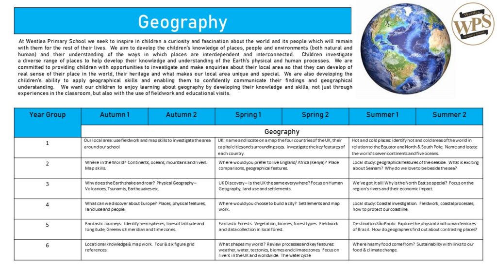 At Westlea Primary School we seek to inspire in children a curiosity and fascination about the world and its people which will remain with them for the rest of their lives. We aim to develop the children’s knowledge of places, people and environments (both natural and manmade) and their understanding of the ways in which places are dependent upon each other and connected with other. Children investigate a diverse range of places to help develop their knowledge and understanding of the Earth’s physical and human processes. We are committed to providing children with opportunities to investigate and make enquiries about their local area so that they can develop of real sense of their place in the world, their heritage and what makes our local area unique and special. We are also developing the children’s ability to apply geographical skills and enabling them to confidently communicate their findings and geographical understanding. We want our children to enjoy learning about geography by developing their knowledge and skills, not just through experiences in the classroom, but also with the use of fieldwork and educational visits.