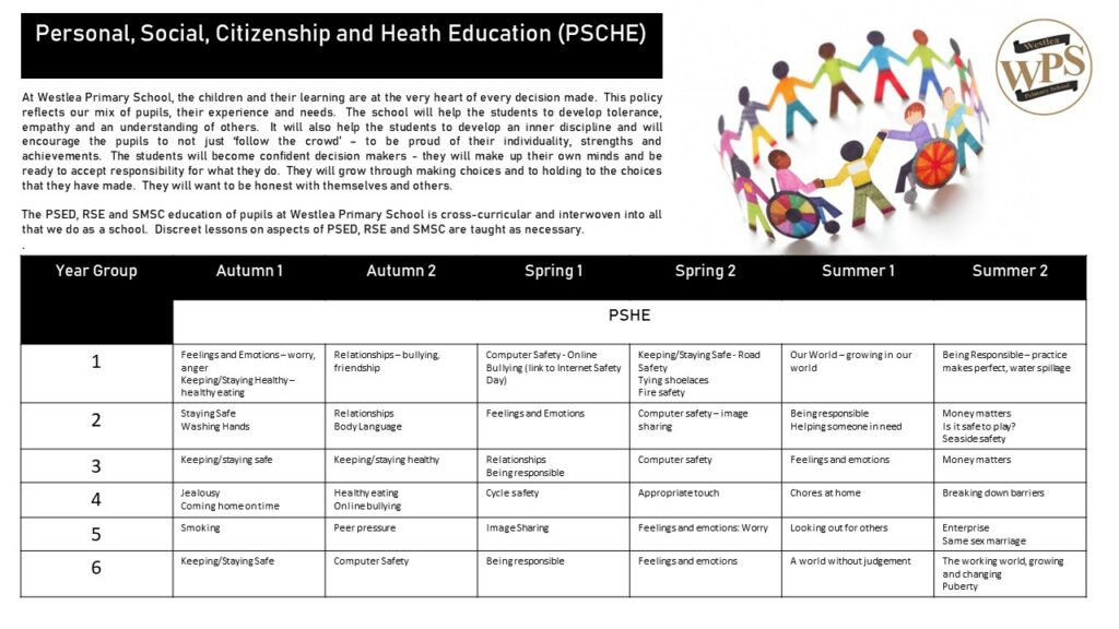 The PSED, RSE and SMSC education of pupils at Westlea Primary School is cross-curricular and interwoven into all that we do as a school. Discreet lessons on aspects of PSED, RSE and SMSC are taught as necessary.