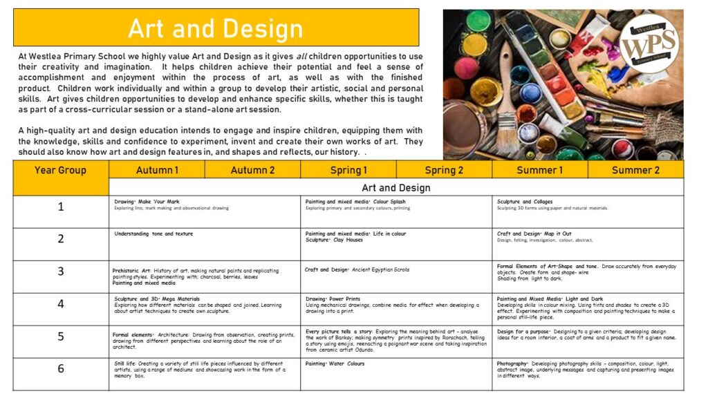 At Westlea Primary School we highly value Art and Design as it gives all children opportunities to use their creativity and imagination. It helps children achieve their potential and feel a sense of accomplishment and enjoyment within the process of art, as well as with the finished product. Children work individually and within a group to develop their artistic, social and personal skills. Art gives children opportunities to develop and enhance specific skills, whether this is taught as part of a cross-curricular session or a stand-alone art session.