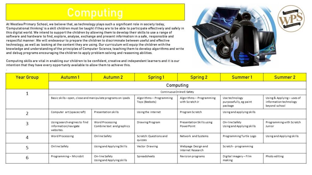 At Westlea Primary School, we believe that, as technology plays such a significant role in society today, ‘Computational thinking’ is a skill children must be taught if they are to be able to participate effectively and safely in this digital world. We intend to support the children by allowing them to develop their skills to use a range of software and hardware to find, explore, analyse, exchange and present information in a safe, responsible and respectful manner. We will endeavour to prepare the children to discriminate between useful and effective technology, as well as looking at the content they are using. Our curriculum will equip the children with the knowledge and understanding of the principles of Computer Science, teaching them to develop algorithms and write and debug programs encouraging the children to apply problem solving and reasoning abilities.