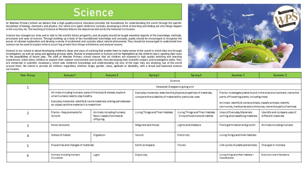 Science in our school is about developing children’s ideas and ways of working that enable them to make sense of the world in which they live through investigation, as well as using and applying process skills. The staff at Westlea Primary school ensure that all children are exposed to high quality teaching and learning experiences, which allow children to explore their outdoor environment and locality, thus developing their scientific enquiry and investigative skills. They are immersed in scientific vocabulary, which aids children’s knowledge and understanding not only of the topic they are studying, but of the world around them. We intend to provide all children regardless of ethnic origin, gender, class, aptitude or disability, with a broad and balanced science curriculum.